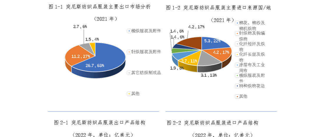 根据联合国统计司数据,2021年突尼斯对全球出口纺织品服装27.3亿美元,几乎全部出口至欧洲(法国占比34%,意大利占21%,德国占13%,荷兰7%,比利时占7%)。同期,突尼斯从全球进口纺织品服装21.9亿美元,主要进口来源国为意大利(占19%)、法国(16%)、土耳其(14%)、中国(9%)和德国(7%)等。根据突尼斯商务和出口发展统计部(Ministère du Commerce et du Développement des Exportations statistics)数据,2022年突尼斯对全球出口纺织品服装42亿美元,主要出口产品以梭织和针织服装为主,占比高达90%;同期从全球进口纺织品服装24.2亿美元,主要进口产品为棉制纱线及织物(占比22%)、针织面料(占比17%)和化纤制纱线及织物(占比24%)等上游产品。