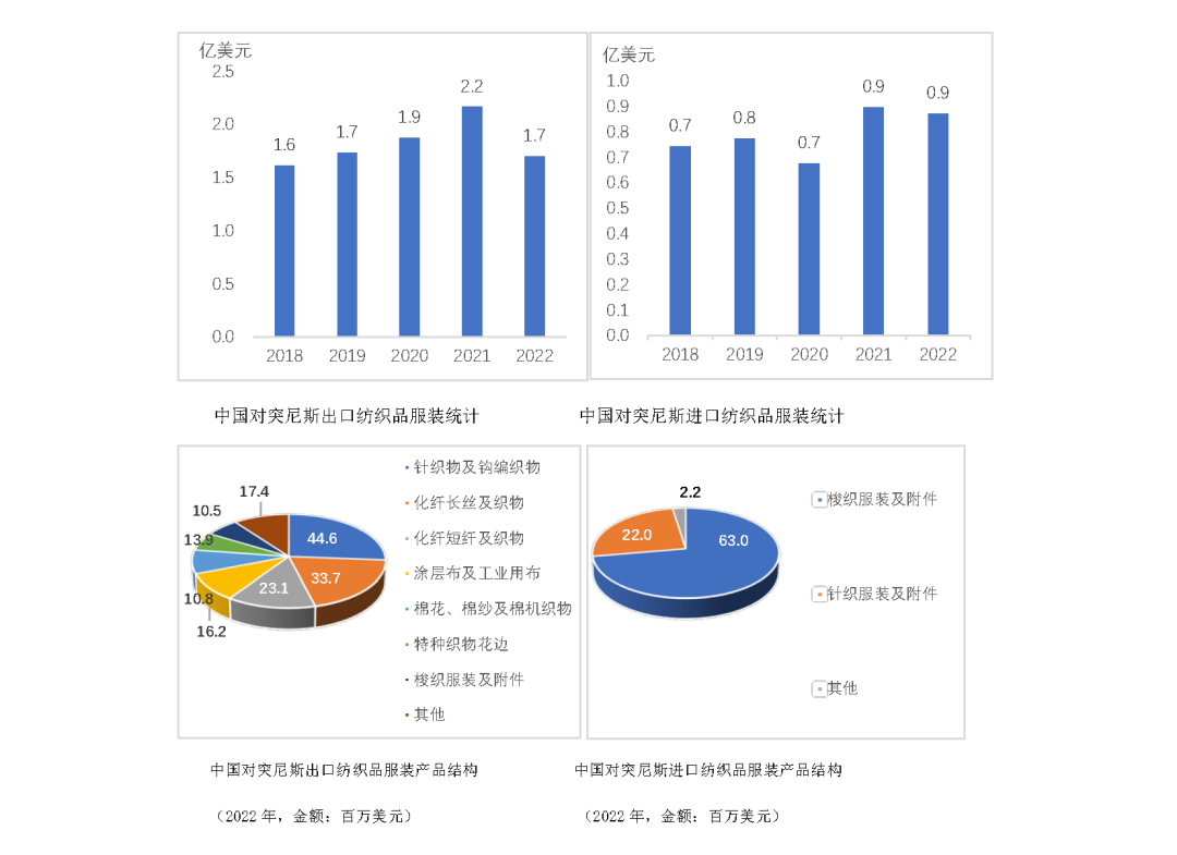 2022年,中国对突尼斯出口纺织品服装1.7亿美元,主要出口产品包括针织面料(占比26.2%)、化学纤维纱线及面料(化纤短纤及长丝纱线、织物合计占比33.3%)等。同期,中国自突尼斯进口纺织品服装8712万美元,主要进口产品为针梭织服装及衣着附件,占比超过97.5%。