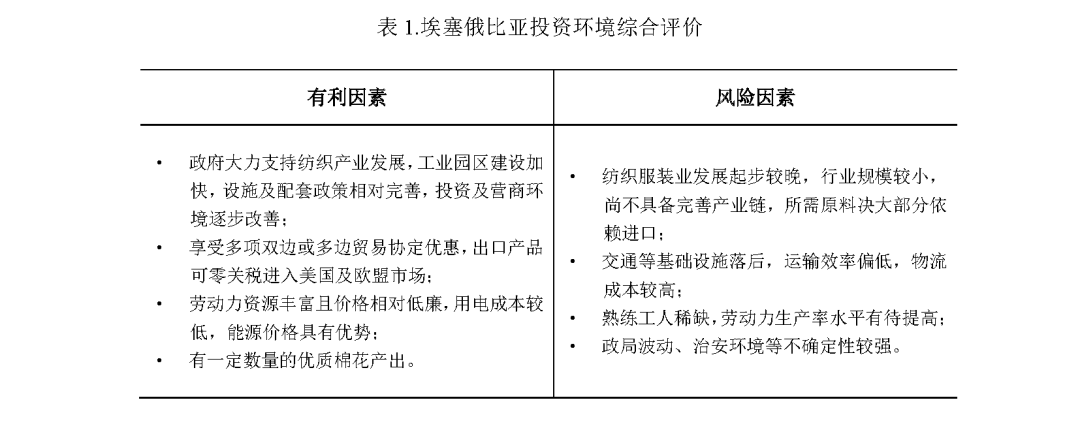 (1)近年来,埃塞俄比亚经济发展总体较为平稳,营商环境及吸引外资水平均居东非地区首位,政府将纺织服装业作为国内优先发展的行业之一,积极改善纺织业投资环境及前景;