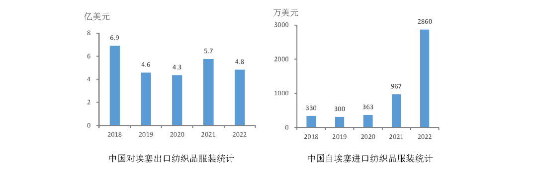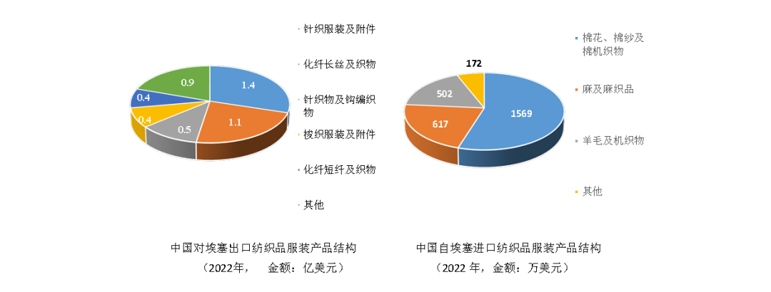 随着投资合作深入,中埃纺织品服装贸易往来也日益密切,近年来贸易规模在新冠肺炎疫情冲击下仍基本保持稳定。根据中国海关数据,2022年中国与埃塞俄比亚纺织品服装进出口总额达5.1亿美元,其中,中国对埃塞出口4.8亿美元,主要出口产品包括服装及衣着附件(1.8亿美元,占比37.5%)、化纤长丝及织物(1.1亿美元,占比22.9%)、针织物及钩编织物(占比10.4%)等。中国自埃塞进口纺织品服装规模较小,仅为中国对埃塞出口纺织品服装规模的6%左右,但近年来保持较快增势,2022年中国自埃塞进口纺织品服装金额约为2860万美元,其中天然纤维及制品进口规模是绝对主体,棉花、麻、羊毛纱及织物等天然纤维原料及制品合计占进口总额的比重达90%以上。
