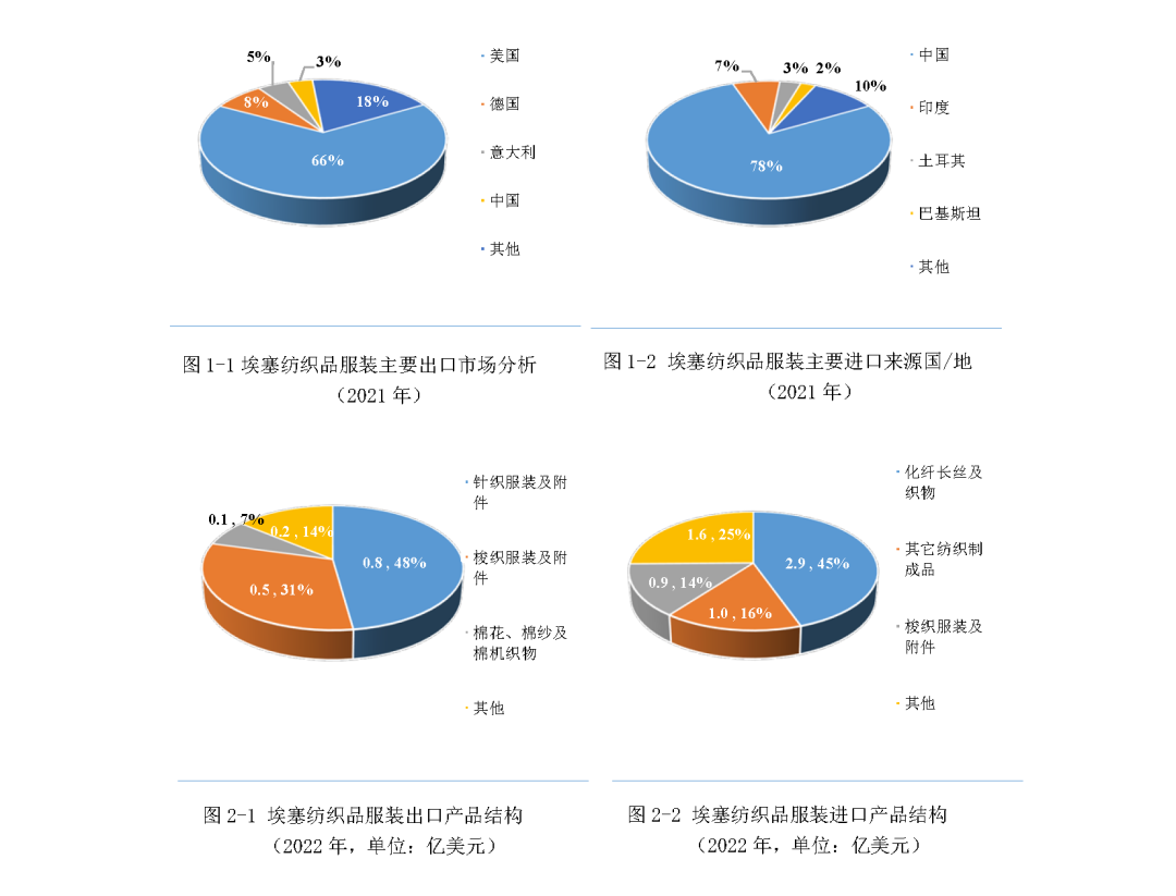2022年,埃塞自全球进口纺织品服装金额为6.5亿美元,其中化纤长丝及织物(2.9亿美元,占比44.5%)、梭织服装及附件(占比14.4%)等是主要进口大类产品。中国是埃塞最大的纺织品服装进口来源国,2021年埃塞自中国进口纤维原料、纺织品服装金额共4.4亿美元,占比达到78%;此外印度(占比6.9%)、土耳其(占比3.1%)、巴基斯坦(占比2.2%)也是埃塞主要纺织品服装进口来源国。