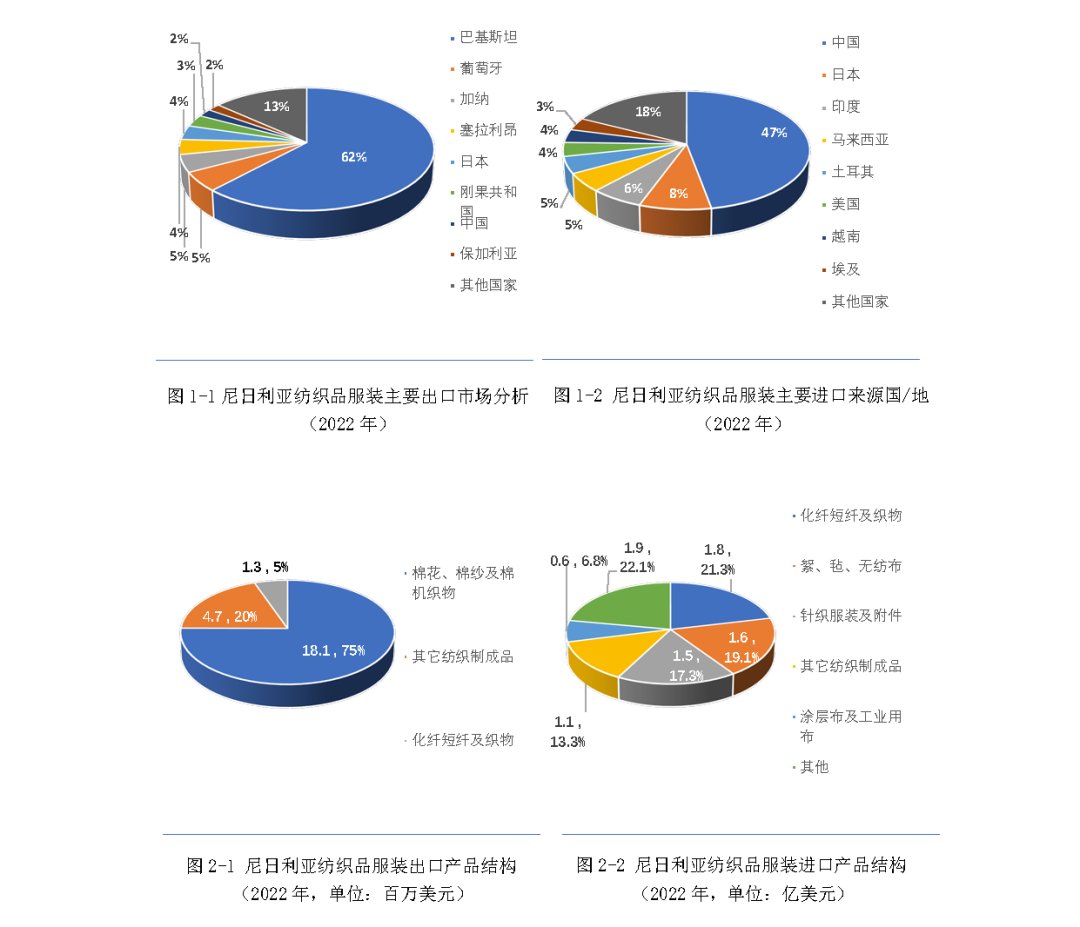 (1)尼日利亚是非洲第一大经济体和第一人口大国,经济发展相对稳定,年轻人口占比大,纺织品服装消费容量具备增长条件,是中国在非洲最重要的纺织品服装出口市场之一。地理位置可辐射西非、中非和北非大部分市场,作为纺织品服装贸易中转站区位优势明显。
