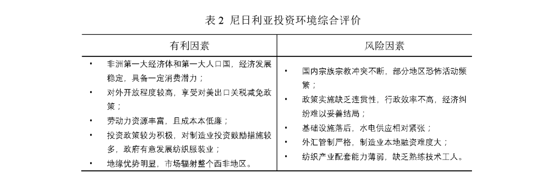 (2)对外开放程度整体较高,政府发展棉纺、化纤等纺织产业链上游环节的意愿较强,对纺织产业外国投资持欢迎态度,且拥有数量充足且成本相对低廉的劳动力,对美国出口纺织品服装享受关税减免政策,为在当地发展出口加工型企业提供了较好环境。考虑要素条件及政策环境,尼日利亚在发展棉纺织、服装加工等领域具有一定投资条件。