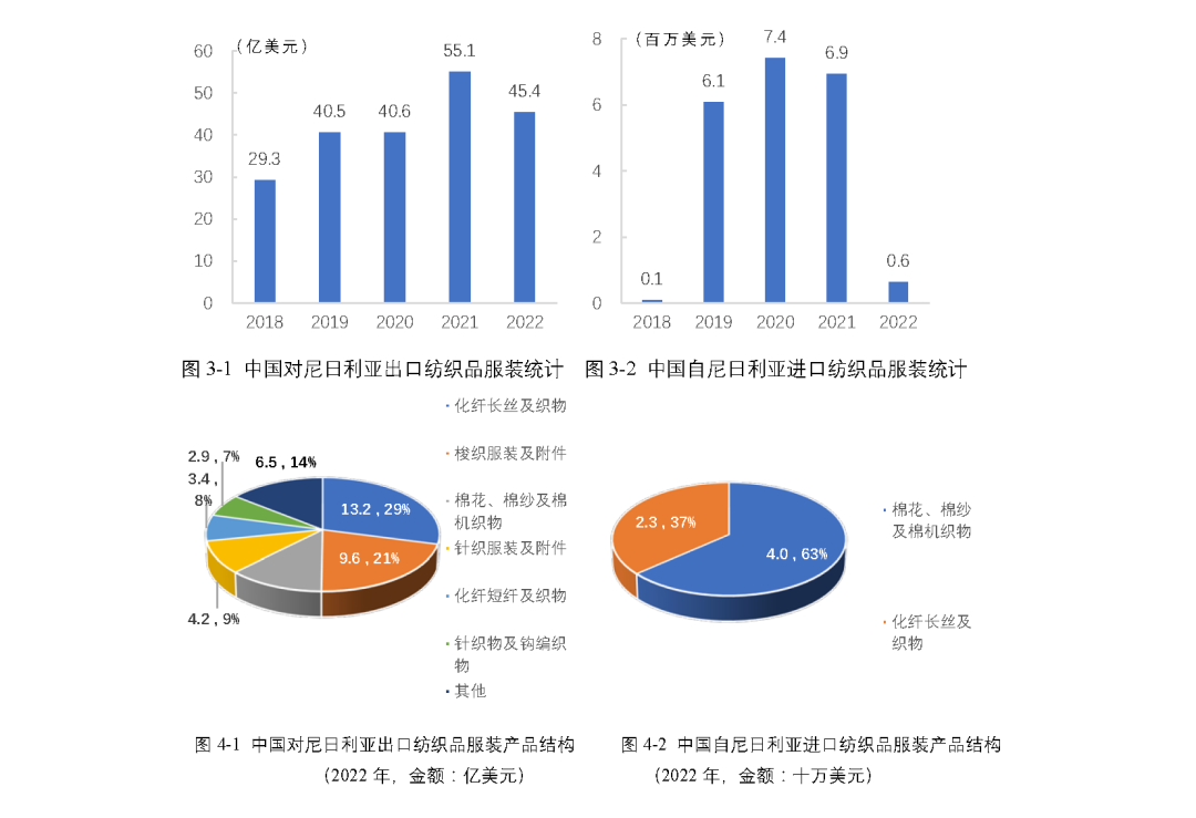 根据中国海关统计,2022年,中国与尼日利亚纺织品服装进出口总额为46亿美元,中国对尼出口额为45.4亿美元,自尼进口额仅为60万美元,尼贸易逆差较大。中国对尼主要出口产品为化纤长丝及织物(占比29%),梭织服装(占比21%),棉花、棉纱及棉机织物(占比12%);自尼进口产品仅有棉花、棉纱及棉机织物(占比63%),以及化纤长丝及织物(占比37%)。