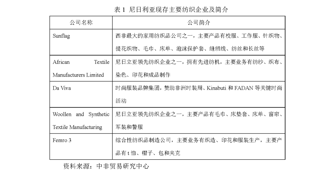 尼日利亚纺织企业大多集中在港口城市拉各斯及其周边区域。邦德克里克工业园始建于2014年,以纺织为主要产业。现存较大的纺织公司有Sunflag、African Textile Manufacturers Limited、Da Viva、Woollen and Synthetic Textile Manufacturing、Femro 3等,公司简介见下表。
