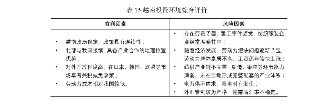 (3)近年来,越南劳动力成本上涨较快,罢工事件时有发生,环保要求较高,我国纺织企业应全面做好成本核算,充分考虑劳资纠纷、环保、限电等风险因素。