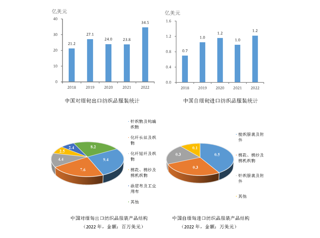 近年来,中国与缅甸纺织品服装贸易规模稳中有升,中国连续多年成为缅甸第一大纺织品服装贸易伙伴和第一大进口来源国。根据中国海关数据,2022年中缅双边纺织品服装贸易总额达35.7亿美元,其中,中国对缅甸纺织品服装出口金额为34.5亿美元,主要出口产品包括针织物及钩编织物(9.4亿美元,占比27.2%)、化纤长丝及织物(7.6亿美元,占比22%)、化纤短纤及织物(4.4亿美元,占比12.8%)、棉纱及机织物(2.5亿美元,占比7.2%)和浸渍、涂布、包覆织物等(2.4亿美元,占比7%)。2022年,中国自缅甸进口纤维原料、纺织品服装金额为1.2亿美元,主要进口产品为服装及衣着附件(合计0.8亿美元)、棉纱及机织物(0.3亿美元)等。