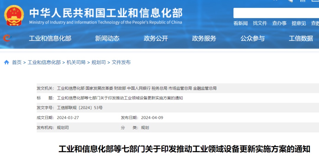 4月9日,工信部等七部门联合印发《推动工业领域设备更新实施方案》,提出围绕推进新型工业化,以大规模设备更新为抓手,实施制造业技术改造升级工程,以数字化转型和绿色化升级为重点,推动制造业高端化、智能化、绿色化发展,为发展新质生产力,提高国民经济循环质量和水平提供有力支撑。