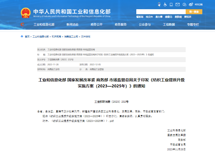 近日工业和信息化部、国家发展改革委、商务部、市场监管总局等四部门联合印发《纺织工业提质升级实施方案(2023—2025年)》。
